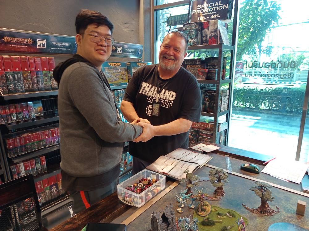 Everything was great. I made lots of friends. I met my wife but I really never met any gamers. There were no game shops in Bangkok at that time. Then I met a guy at a language class in 2015. We were chatting and I asked him what he did for fun. He said he played games. I asked him “what type?” He said “I wouldn’t know.” I said “Try me.” A game called warhammer. I was all in. Apparently a new store opened in 2012 in Bangkok.